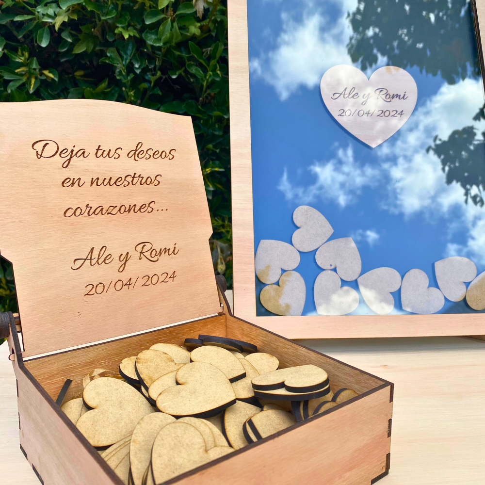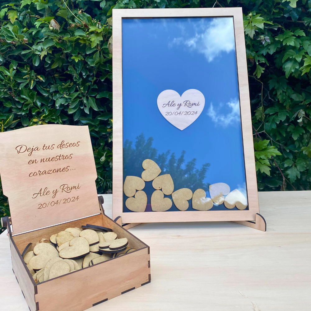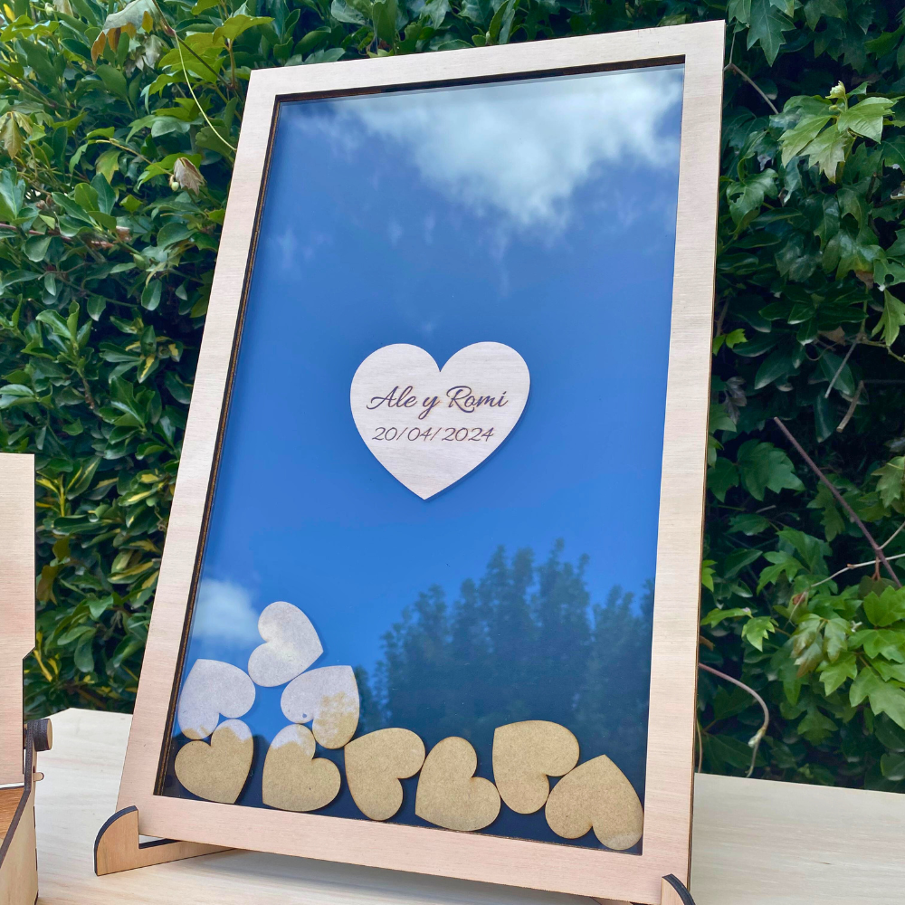 Cuadro de firmas para guardar recuerdos, con fichas de corazones.