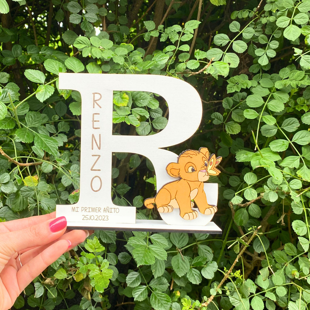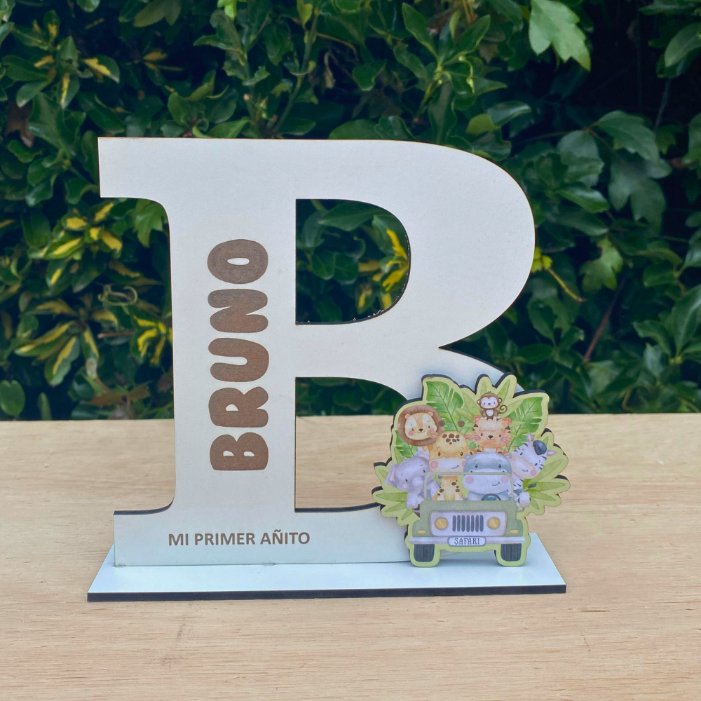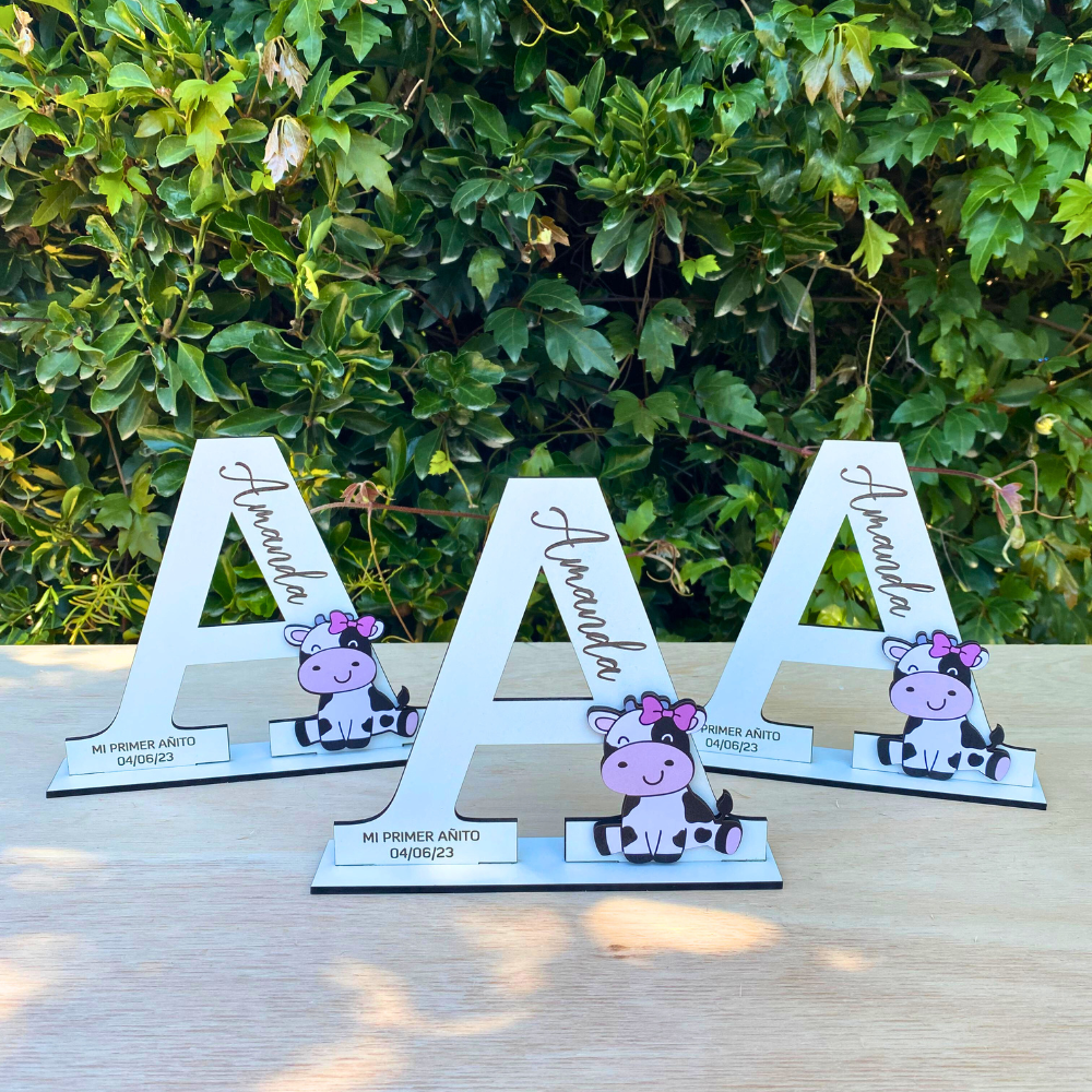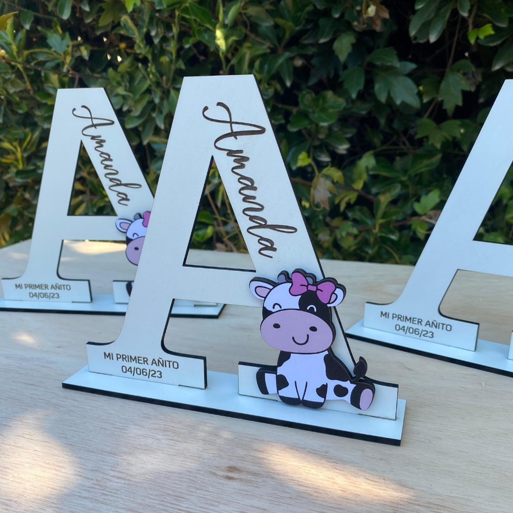 Centros de mesa de inicial o número, con grabado y aplique a color.