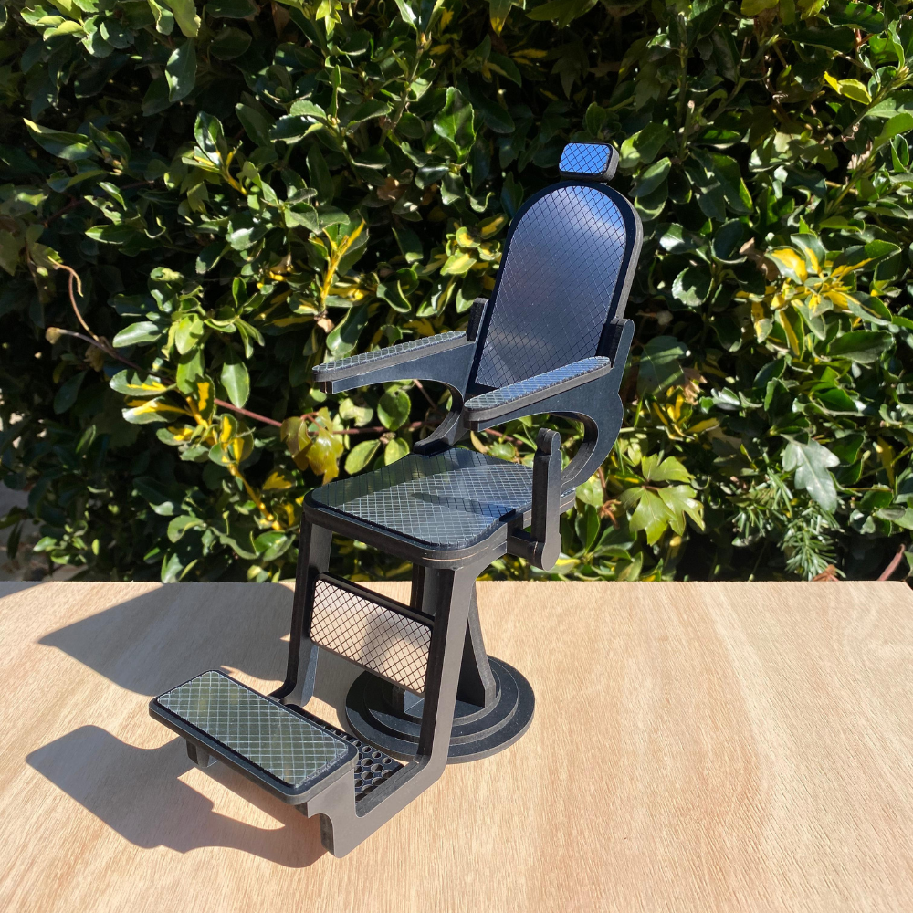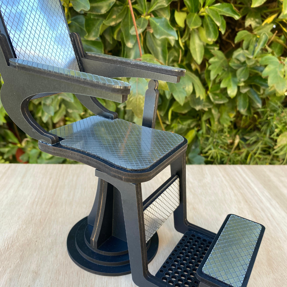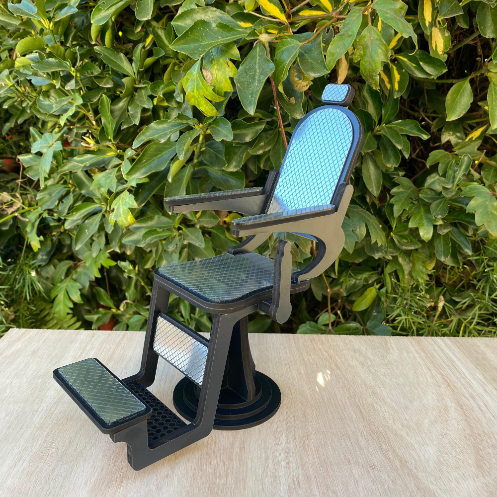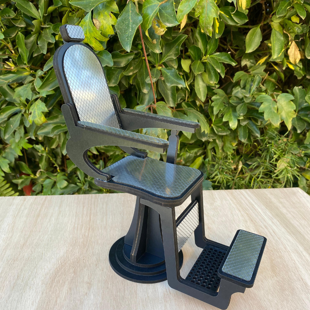 Mini silla de barbero, está hecha en fibro plus negro y metalex plateado.